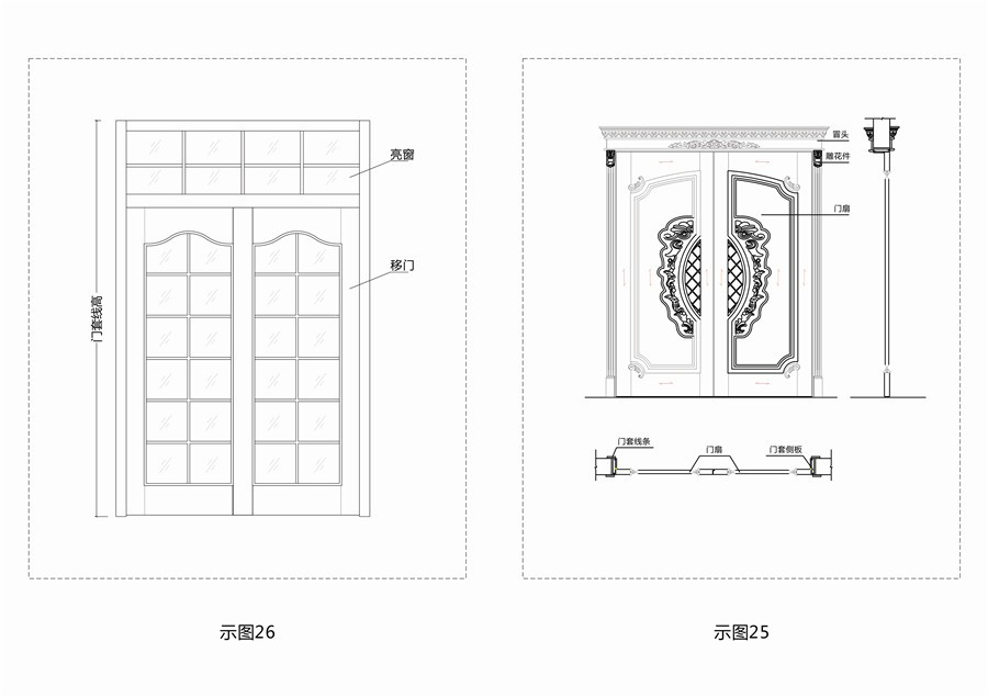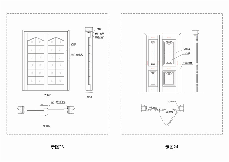 2.移門(mén)套(推拉套):用于包裹洞口并固定門(mén)扇推拉的稱(chēng)為推拉門(mén)框;(示圖23)