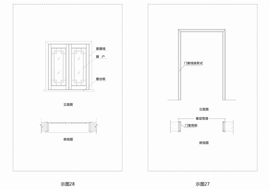 7.窗套:沿窗洞包墻的飾面板。分為帶窗臺(tái)板和不帶窗臺(tái)板。(示圖28)