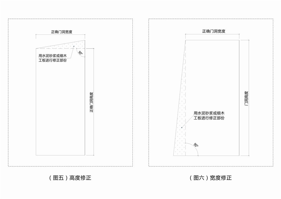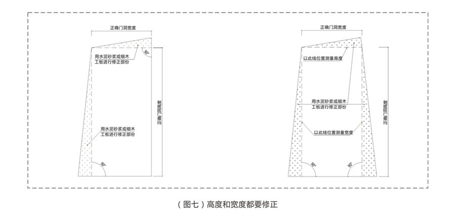 對(duì)于誤差超過(guò)20mm的要對(duì)墻洞進(jìn)行修正,可以用水泥砂漿或石灰進(jìn)行修正。修正圖如下: